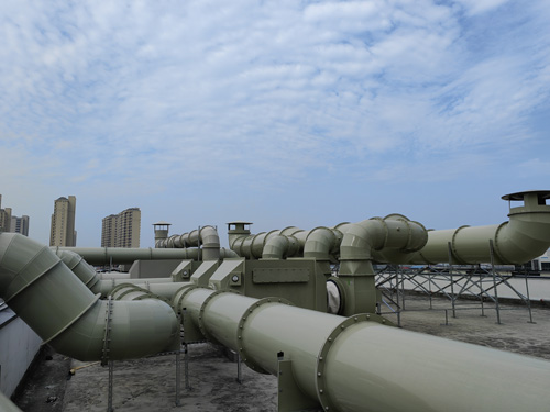 檢測室的廢氣 → 化學活化炭過濾系統器 → 引生產的風機 → 釋放